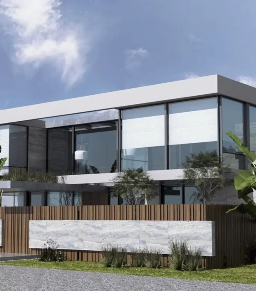 Un proyecto minimalista que celebra la pureza del diseño a traves de ventanales que rodean la estructura, creando un juego de luces y sombras que transforman sus espacios a lo largo del día. Las líneas simétricas aportan un equilibrio visual implecable.