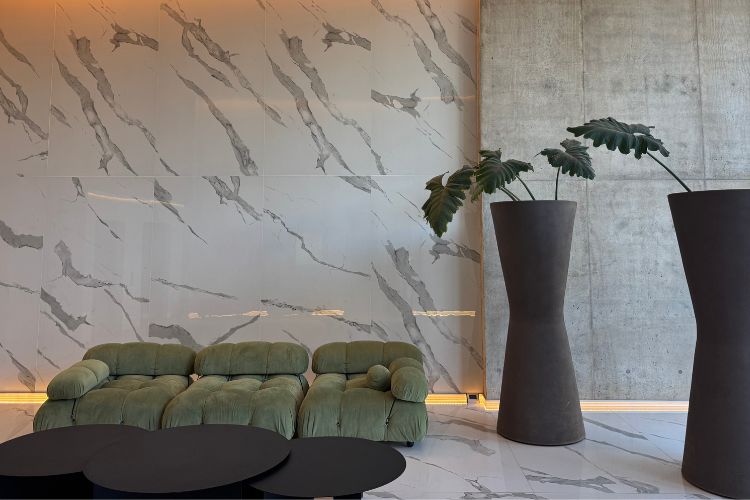 Su hall de acceso de gran importancia en doble altura, consta de dos núcleos de ascensores de gran porte y velocidad. También tiene capacidad de cocheras para 73 automóviles a las que se accede por rampa de doble circulación.
