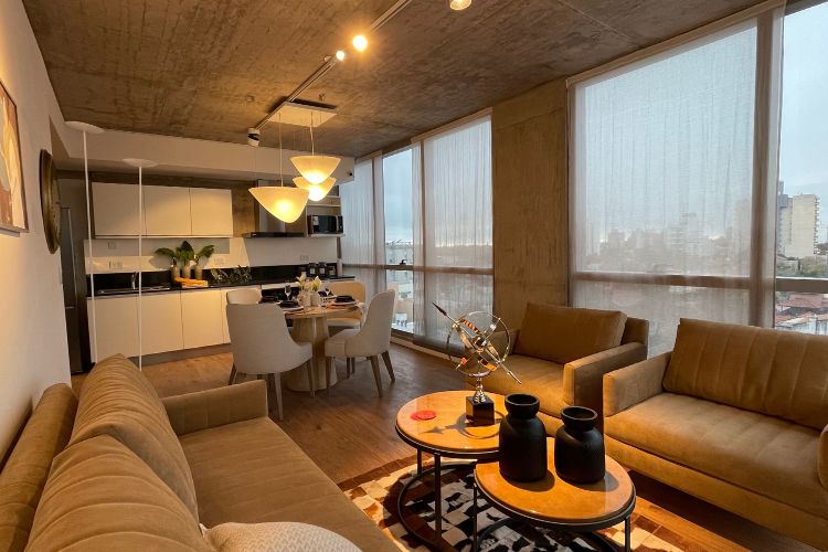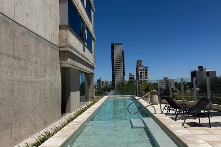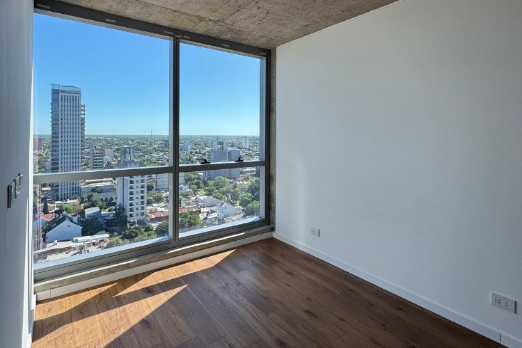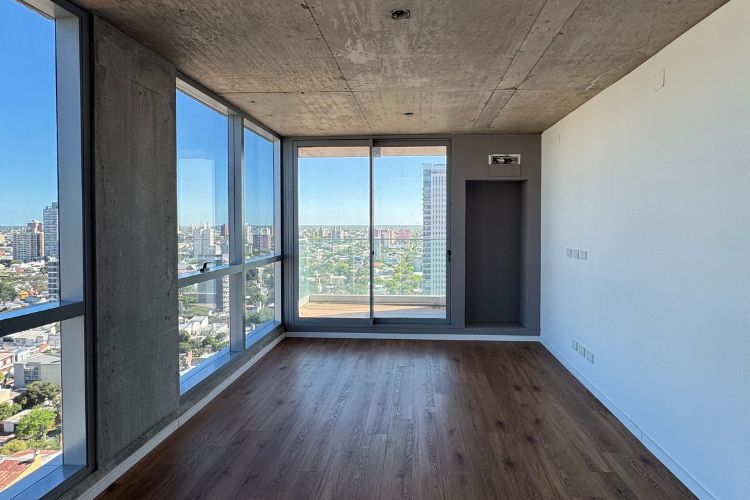 Amplio living comedor, en el que destaca su estructura en hormigón armado y cerramientos en aluminio con sistema doble vidriado hermético que aportan solidez en la construcción. De interiores amplios, luminosos y cómodos, con pisos y revestimientos en porcelanatos de primera calidad, paredes de mampostería revestida en placa de yeso, cielorasos de hormigón a la vista en espacios comunes y de durlock en núcleos húmedos. Además, tiene un piso de amenities con pileta, solarium, SUM, gimnasio y áreas recreativas.