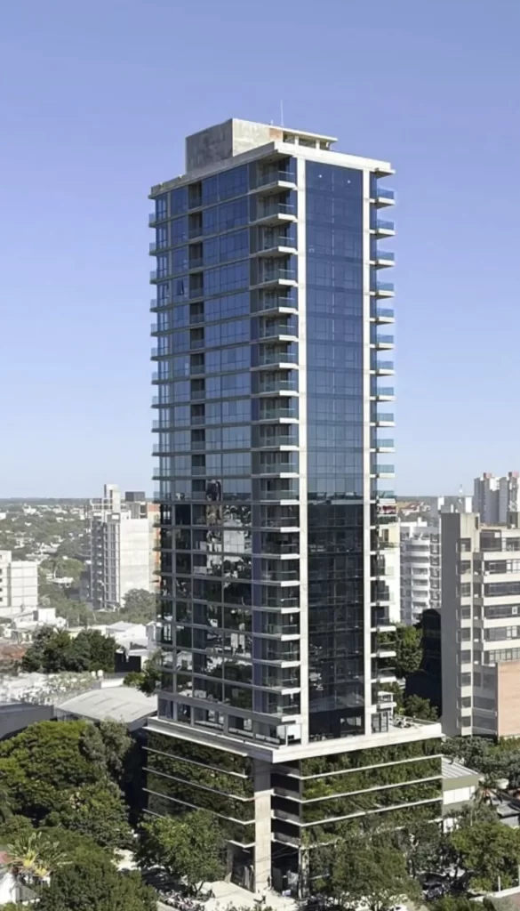 La ubicación de las cocheras responde a la situación de napas altas características de la topografía de la ciudad de Resistencia. Esta situación condicionó la localización de las cocheras en subsuelos, las que se ubicaron en 4 niveles de basamento y se lo convirtió en un elemento de fuertes lineas horizontales de vigas invertidas de hormigón visto y un jardín vertical de cerramiento. De esta forma se volvía a recaracterizar esa esquina, al utilizar la vegetación vertical como barrera visual de fachada verde. Todo el proyecto se destaca por la calidad de materiales nobles de bajo mantenimiento y confort.