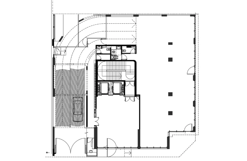 Desarrolla un basamento de cocheras revestido por vegetación, recuperando una de las características de esa icónica esquina.
