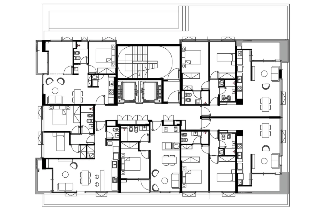 La planta tipo en el piso 6 esta compuesta de cinco unidades funcionales, y a medida que sube en niveles se van fusionando en nuevas tipologías de más ambientes hasta terminar en dos semipisos de mayores prestaciones en los últimos cuatro niveles.